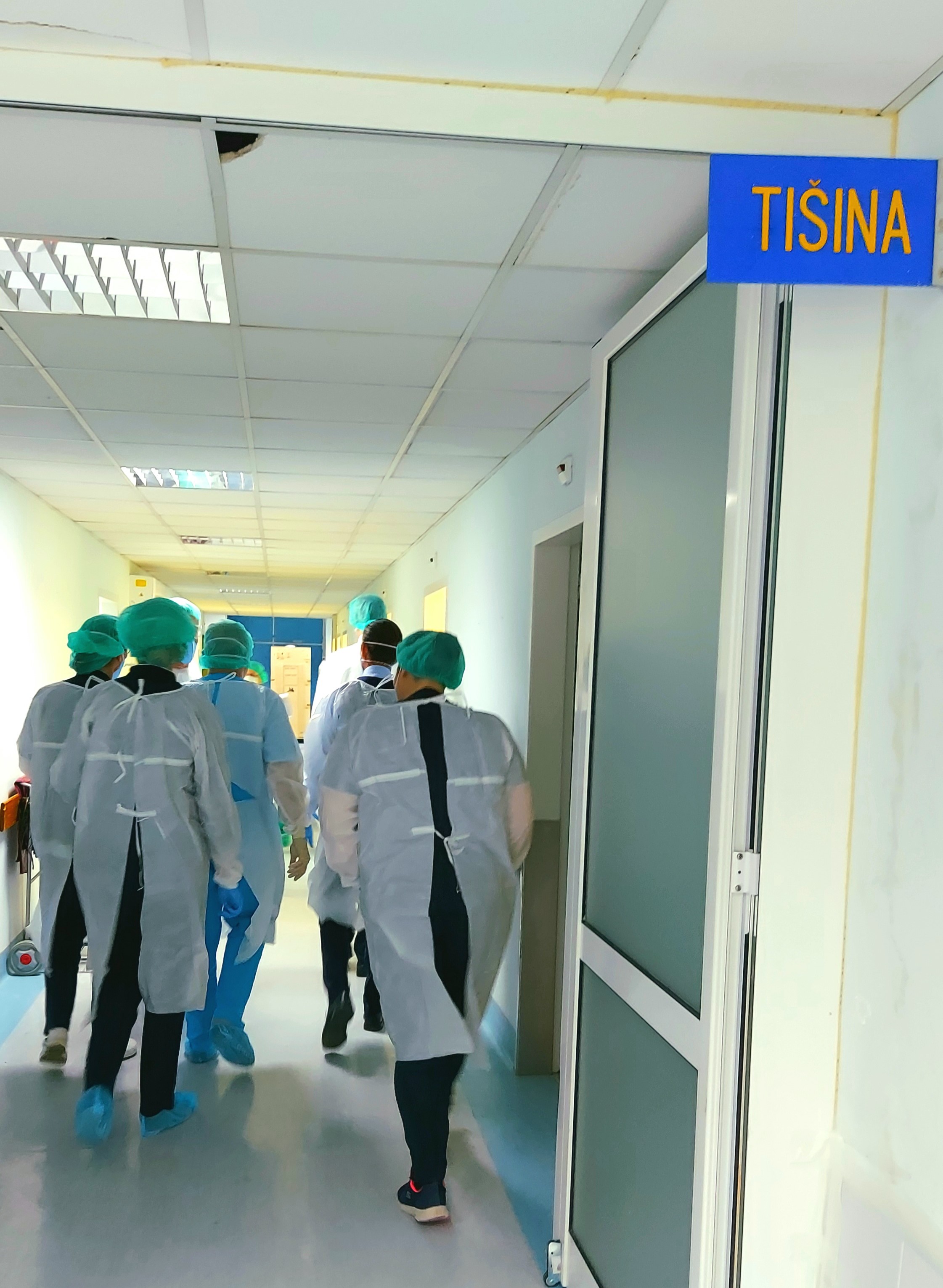 Iako znak traži tišinu, ona je nemoguća jer se iz soba s pacijentima stalno čuju alarmi respiratora i drugih monitora.